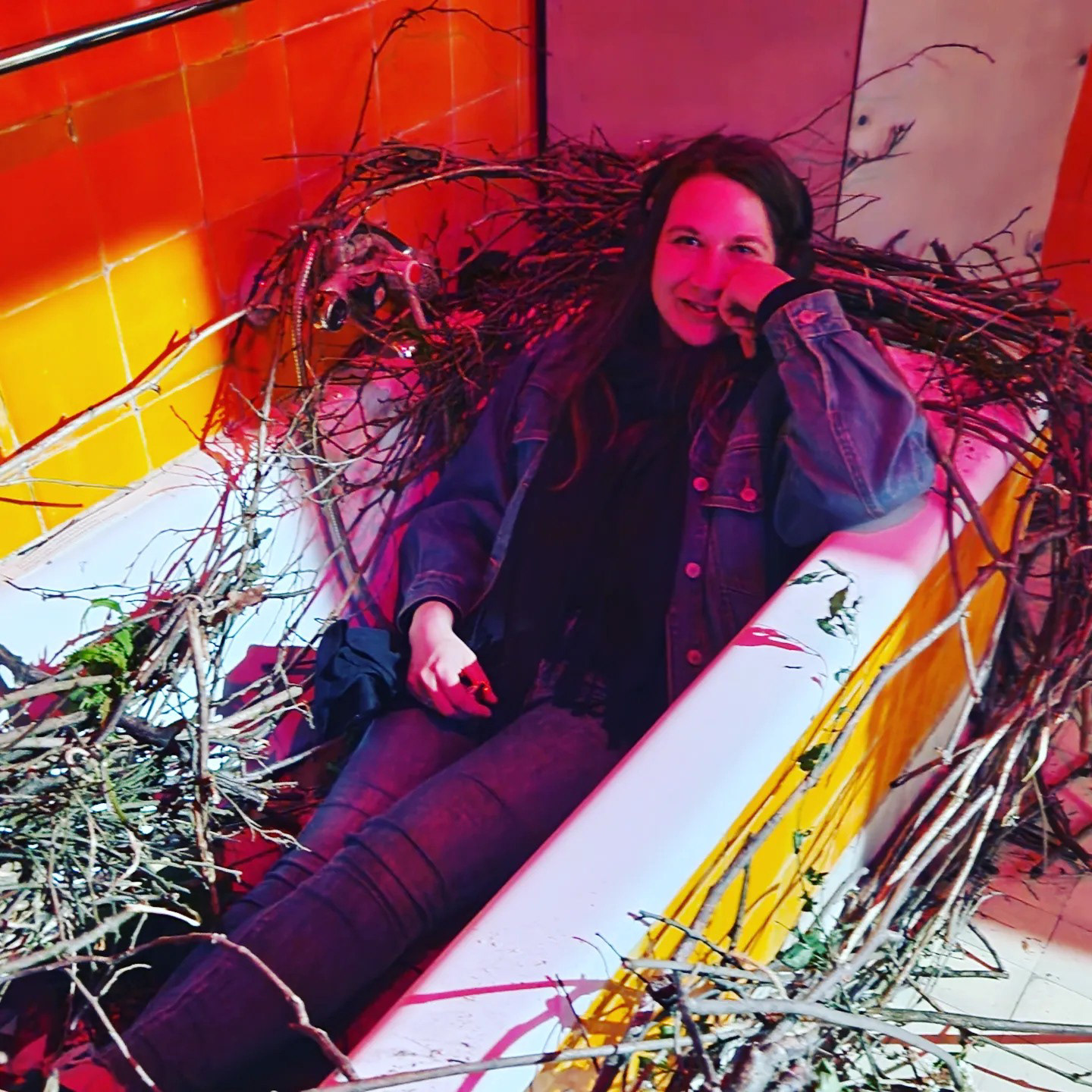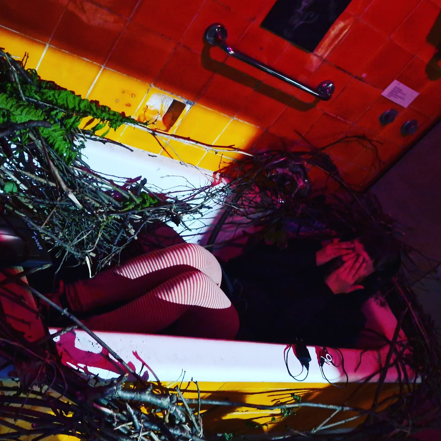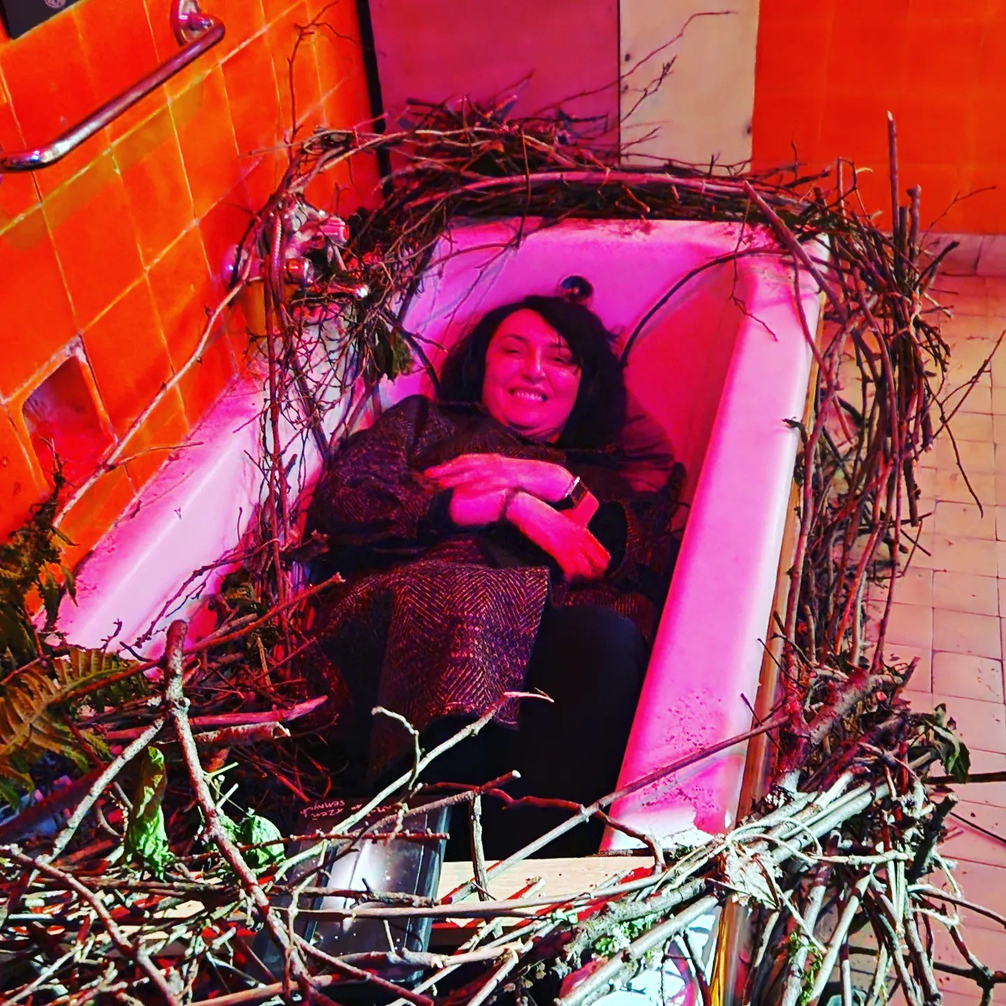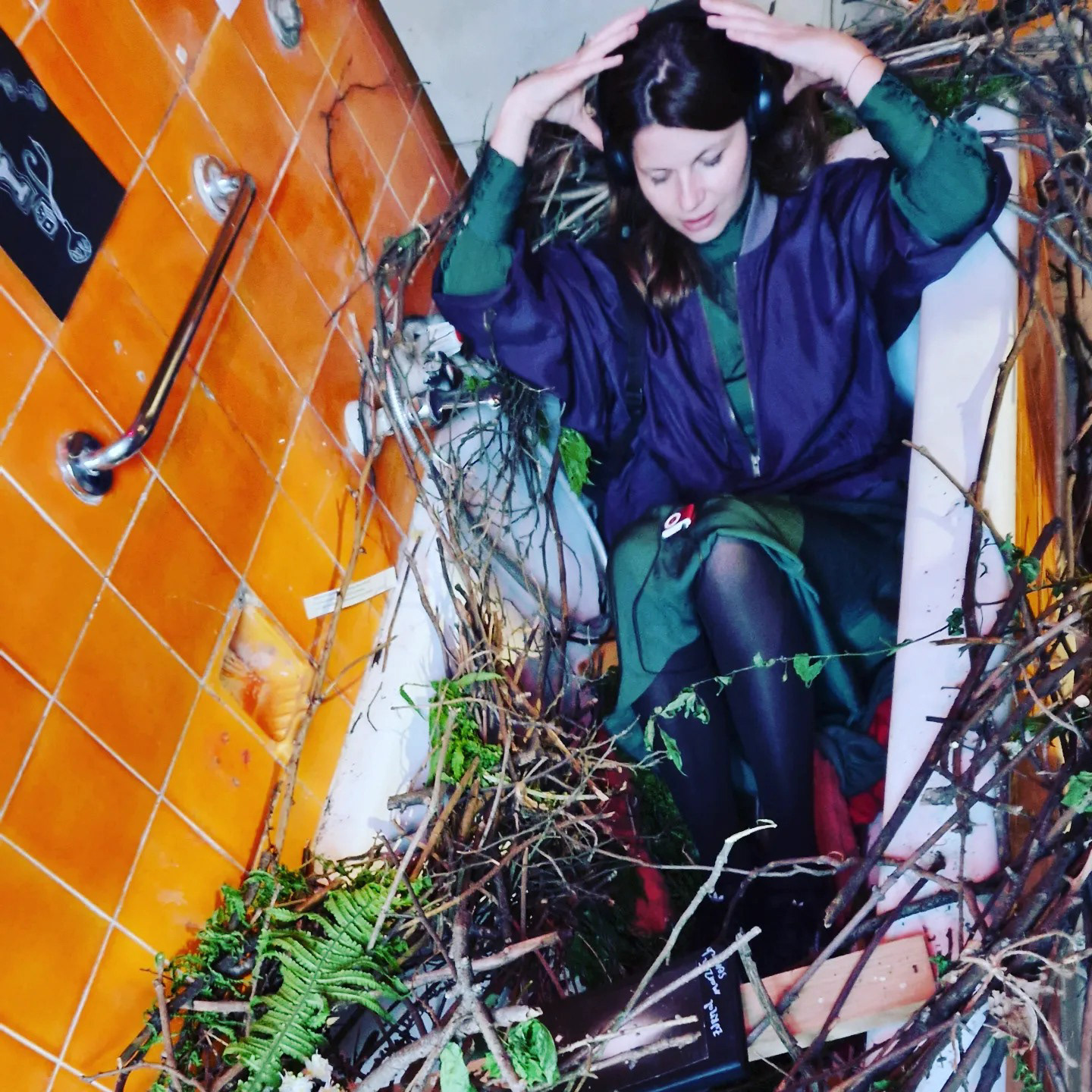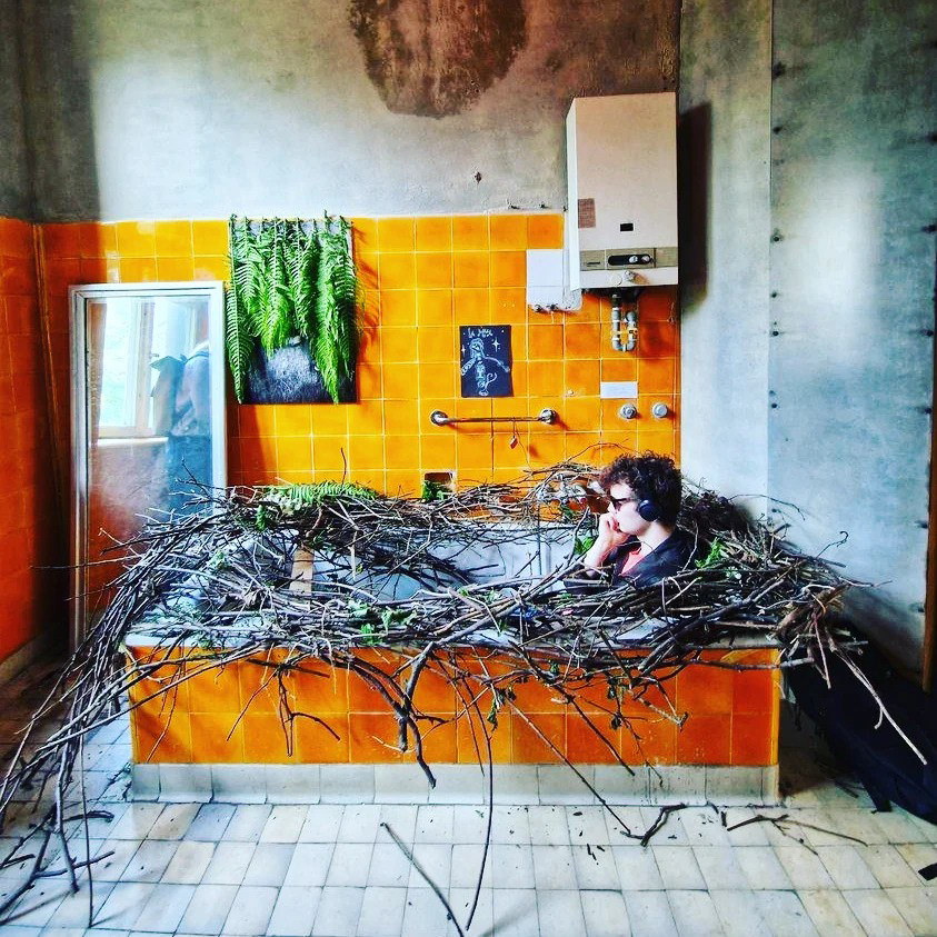Instalacja side- specific, kąpiel w gałęziach z ogrodu, słuchowisko "Ptaki nie mają twarzy" według mojego autorskiego opowiadania inspirowanego życiem surrealisty Maxa Ernsta, który nazywał się Lop Lopem, Ptakiem Przełożonym i uważał, że wykluł się z jaja. Gniazdo uwiłam w wannie w willi na wzgórzu św. Bronisławy, w CSW Wiewiórka jako część wystawy Ornitologicznej w ramach tygodnia galerii krakowskich KRAKERS 2023.