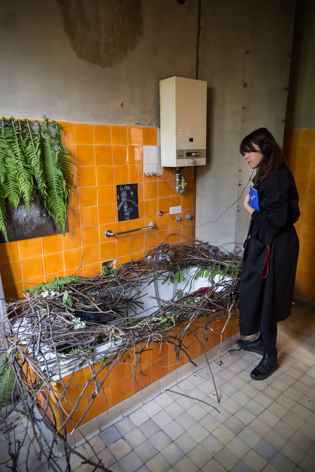 Side-specific installation, fragrant branches bath, radio drama on headphones "Birds without faces" based on my short story inspired by the life of the surrealist Max Ernst, who called himself Lop Lop, the Superior Bird, and believed that he was hatched from an egg. I built the nest in a bathtub in a villa on St. Hill. Bronisława, at CSW Wiewiórka as part of the Ornithological exhibition at Cracow gallery week KRAKERS 2023.