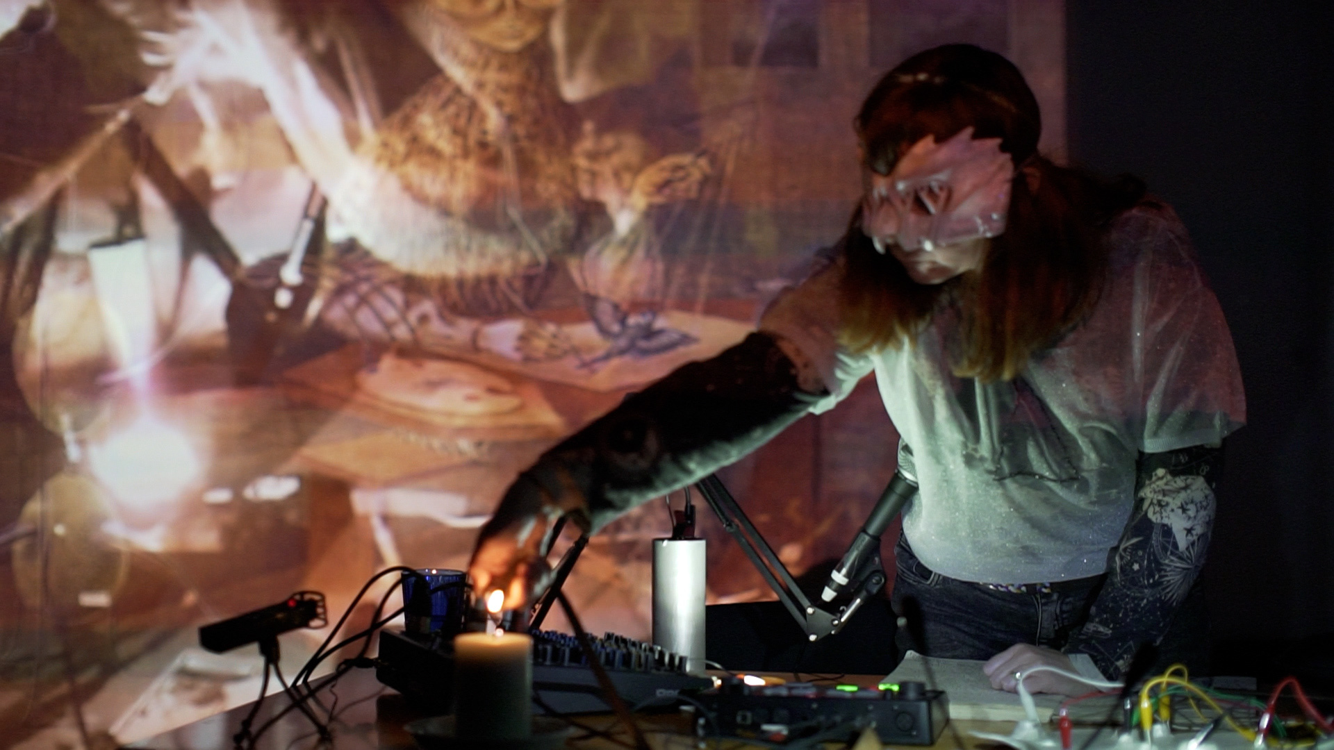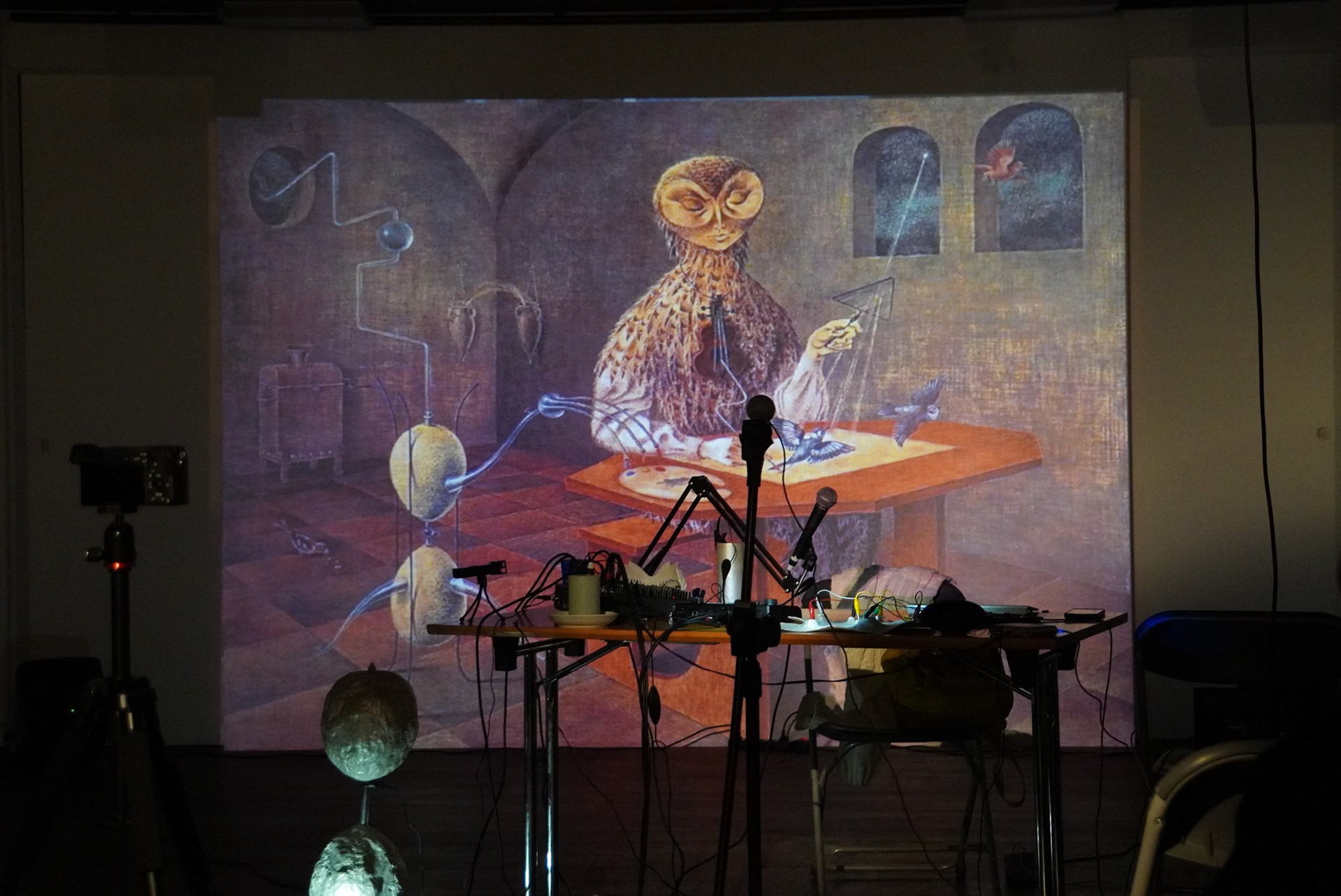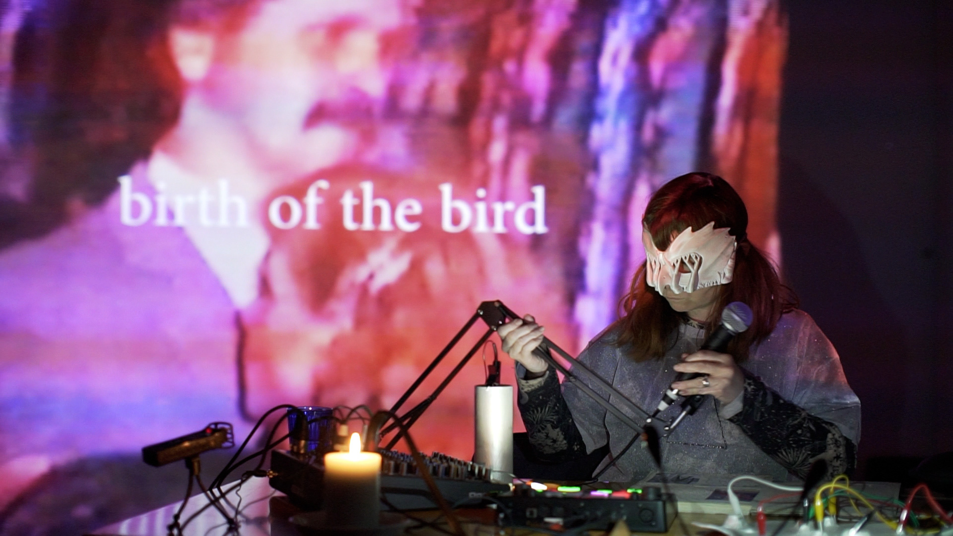 Oneironithos is a combination of the Greek words "oneiro" - dream, and "ornithos" - bird. The core of the work is a painting by the surrealist Remedios Varo, "The Creation of Birds". I embodied the Owl Woman from the artist's work, who becomes a relay between the visible and invisible world, and using her and alchemical objects from the painting , I create an audio-visual performance. With my own story, my voice and sounds, I present the bird myth of the surrealist Max Ernst, who believed that he hatched from an egg, and using my family VHS recordings, I created an analogous myth of my own birth.