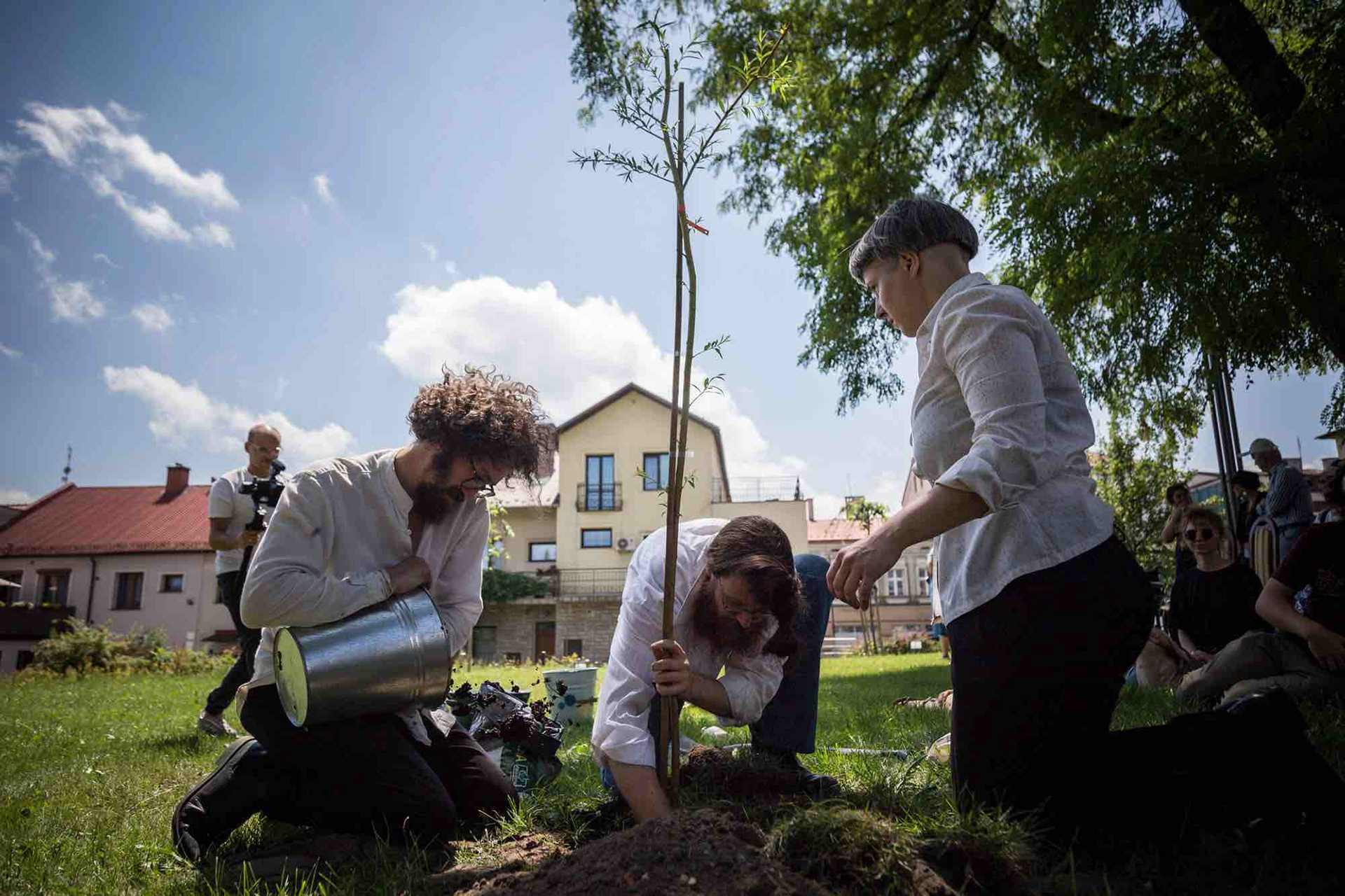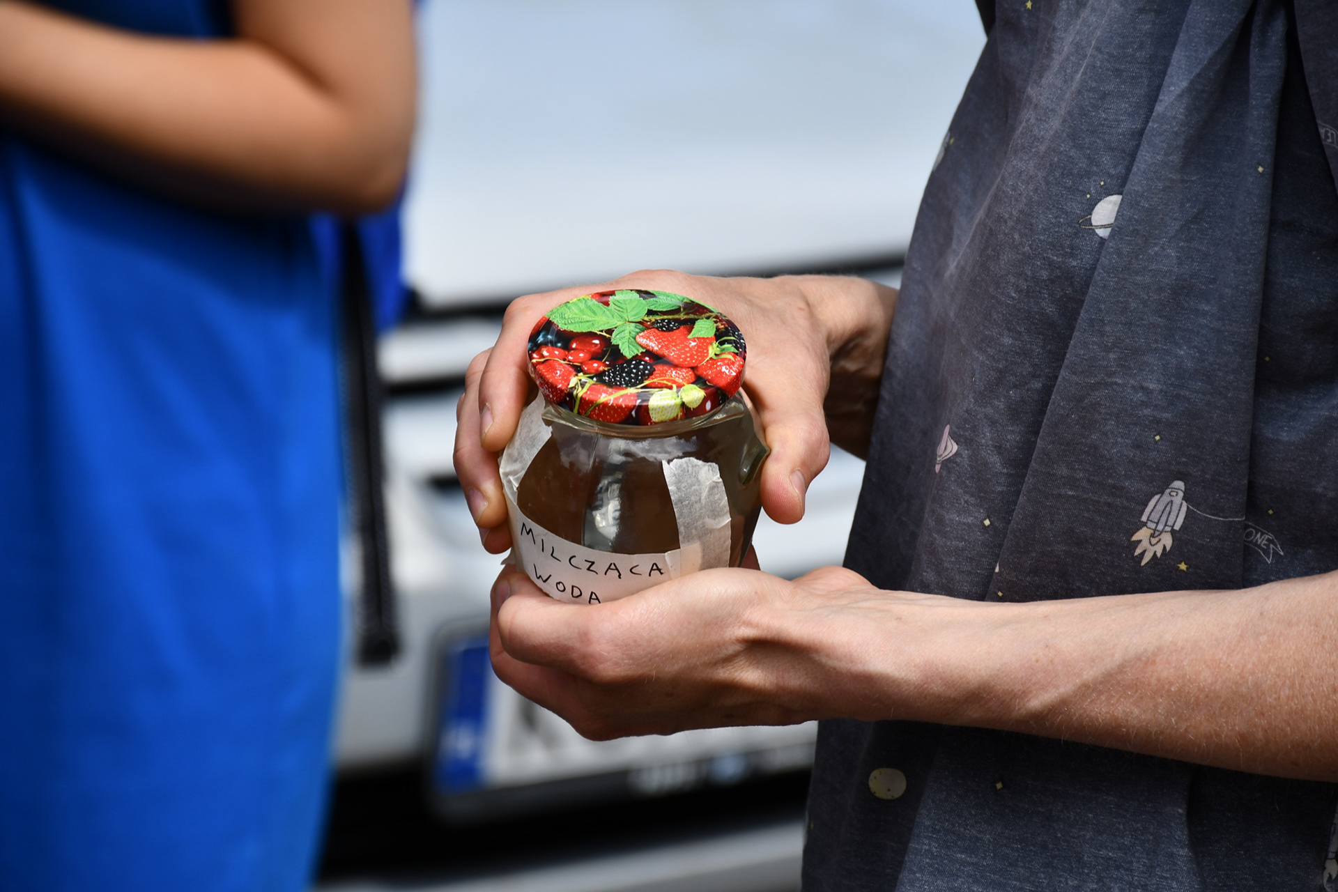 Mianem "milczącej wody" określano wśród Słowian wodę, którą nabierano z płynącego źródła (czyli tzw. wodę żywą) po zapadnięciu zmroku i w milczeniu przynoszono ją do domu. Żywa woda łączyła w sobie elementy płodności i śmierci. Ponieważ wypływała z głębi ziemi, była zimna i głucha niczym grób, wyobrażano sobie, że niosła z sobą magiczne właściwości zaświatów. Aby ich nie zatracić, należało powstrzymać się od jakiegokolwiek jej modyfikowania. Dlatego też wymagano, by czerpać ją po zmroku oraz zachować przy niej absolutne milczenie, aż do rozpoczęcia rytuału. Pojęcie „milczącej wody“ weszło również do kultury żydowskiej. W jidysz mówiono Sztilwaser, sztilszwajgnde waser, i tłumaczono ten termin na hebrajski jako majim szetukim - „milcząca woda“ dr Marek Tuszewicki Spacer milczącej Wody jest częścią długofalowego projektu artystycznego Marty i Kasi Sali oraz Roberta Yerichmiela Snidermana. skupiający się na pracy z pamięcią wokół dawnego placu Estery w Chrzanowie, na którym stała, zburzona w 1973 r., Synagoga Wielka, i gdzie wyrosła jakiś czas później wierzba płacząca. Wierzbę w 2018 roku nieoczekiwanie ścięto. Miasto Chrzanów przed II wojną światową zamieszkiwane było w połowie przez społeczność żydowską, pamięć o niej i jej historii jednak z roku na rok słabnie. Artyści, we wspólnym rytuale z mieszkańcami Chrzanowa i zainteresowanymi, ponownie zasadzili wierzbę płaczącą w miejscu dawnej Synagogi i nazwali ją Wierzbą Estery. Wieczór przed posadzeniem drzewa poprowadziłam Spacer Milczącej Wody w Chrzanowie. Woda z Wisły i Chechły została rozdana wszystkim uczestnikom pochodu i na koniec podlaliśmy nią Wierzbę Estery.